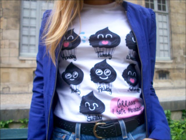 L’ensemble est vraiment basique : short en jean/tee shirt… Oui, mais quel tee shirt mes ami(e)s ! Les motifs cupcakes (so blogueuse mode), le petit message rigolo ainsi que les couleurs girly m’ont vraiment séduits. C’est une création Byjooy de la talentueuse Julie. D’ailleurs, pour découvrir ses dessins, tous aussi géniaux les uns que les autres, je vous recommande vivement sa page Facebook.