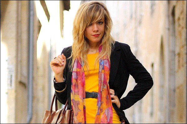 Le jaune moutarde n’est décidément pas une couleur facile à porter et à associer. D’autant plus pour une blonde… Il faut bien faire attention à ne pas tomber dans le fadasse. Mais je trouve qu’avec un bon petit blazer noir pour trancher et un joli foulard, ça passe tout seul.