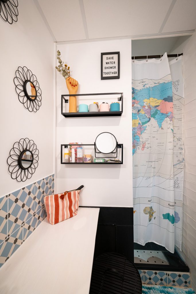 Pour occuper un peu mieux l’espace sur le mur principal de la salle de bain, j’ai choisi un trio de petits miroirs fleurs qui gravitent autour du grand. Je voulais apporter un petit côté déco style mur de cadres / miroirs que l’on ne retrouve pas habituellement dans une salle de bain. C’est pour cela que j’ai repeint le cadre de mon letter board en noir avec le message « Save Water Shower Together » (un petit clin d’oeil ecolo-rigolo).